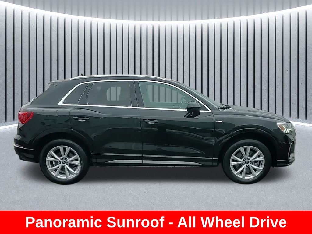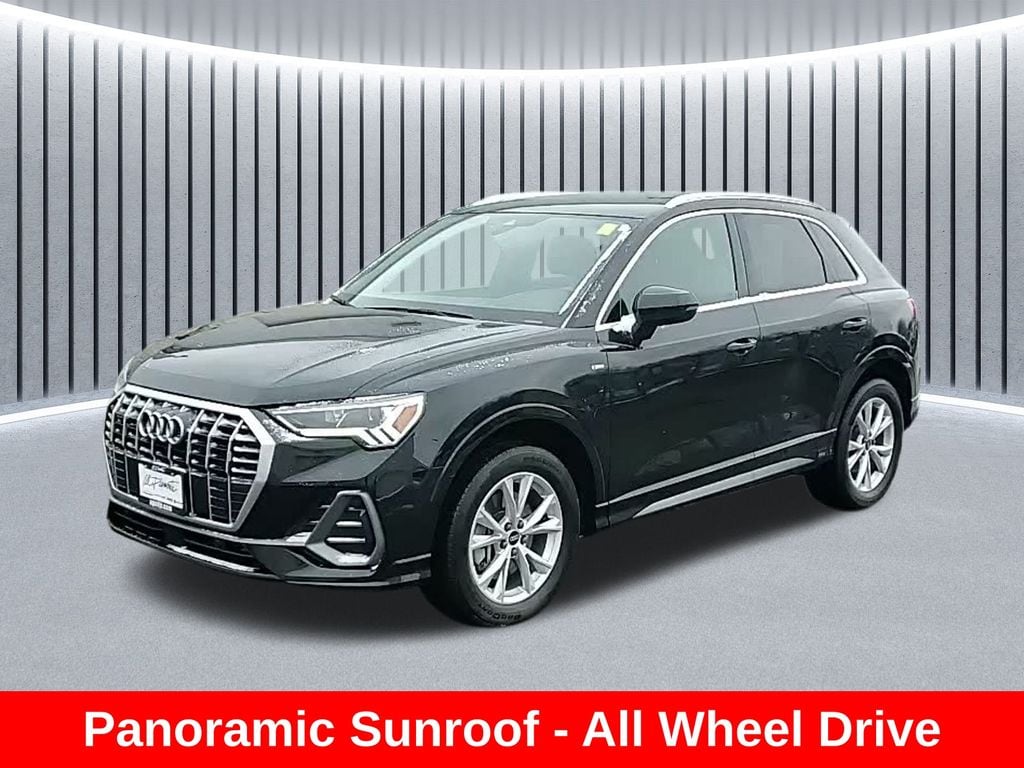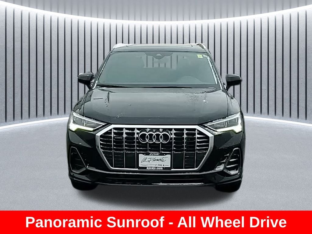 Clean CARFAX. ** Apple CarPlay/Android Auto, ** Adaptive Cruise Control, ** Blind Spot Monitor, ** Cross Traffic Alert, ** Alloy Wheels / Premium Wheels, ** Heated Seats, ** Bluetooth, Hands Free, ** Brake Assist, ** Camera Backup, ** Chrome Wheels / Premium Wheels / Custome Whwels, ** Cruise Control, ** Heated Steering Wheel, ** Keyless Entry, ** Leather Seats, ** Navigation System, ** Power Panoramic (Pano) Sunroof / Moonroof, ** Premium Sound System / Premium Audio, ** Roof Rack, ** Stability Control, ** Steering Wheel Controls, ** USB Port, ** Clean Carfax Accident Free History, ** Power Drivers Seat, AWD, ALL WHEEL DRIVE, Horsepower: 184 hp Torque: 221 lb-ft Transmission: 8-speed automatic Drivetrain: quattro AWD (standard) 0â"60 mph: ~7.4 seconds Top speed: ~125 mph â½ Fuel Economy City: 22 mpg Highway: 29 mpg Combined: ~25 mpg ð" Size & Practicality Seats: 5 Cargo space: about 23.7 cu ft behind the rear seats Max cargo: ~48 cu ft with seats folded Fuel tank: 15.9 gallons ð§° Standard Features (Premium Trim) 10.25-inch Audi Virtual Cockpit digital gauge display 10.1-inch touchscreen infotainment system Apple CarPlay & Android Auto LED headlights Leather seating surfaces Tri-zone automatic climate control, Q3 Premium S Line quattro, 4D Sport Utility, 2.0L 4-Cylinder TFSI, 8-Speed Automatic with Tiptronic, quattro, Mythos Black Metallic, Black w/Rock Gray Stitching w/Leather Seating Surfaces.