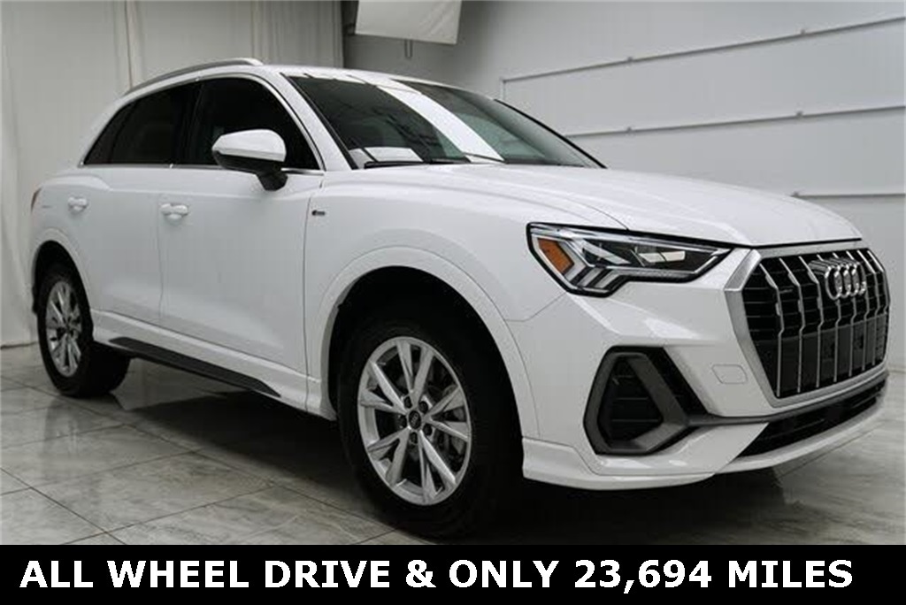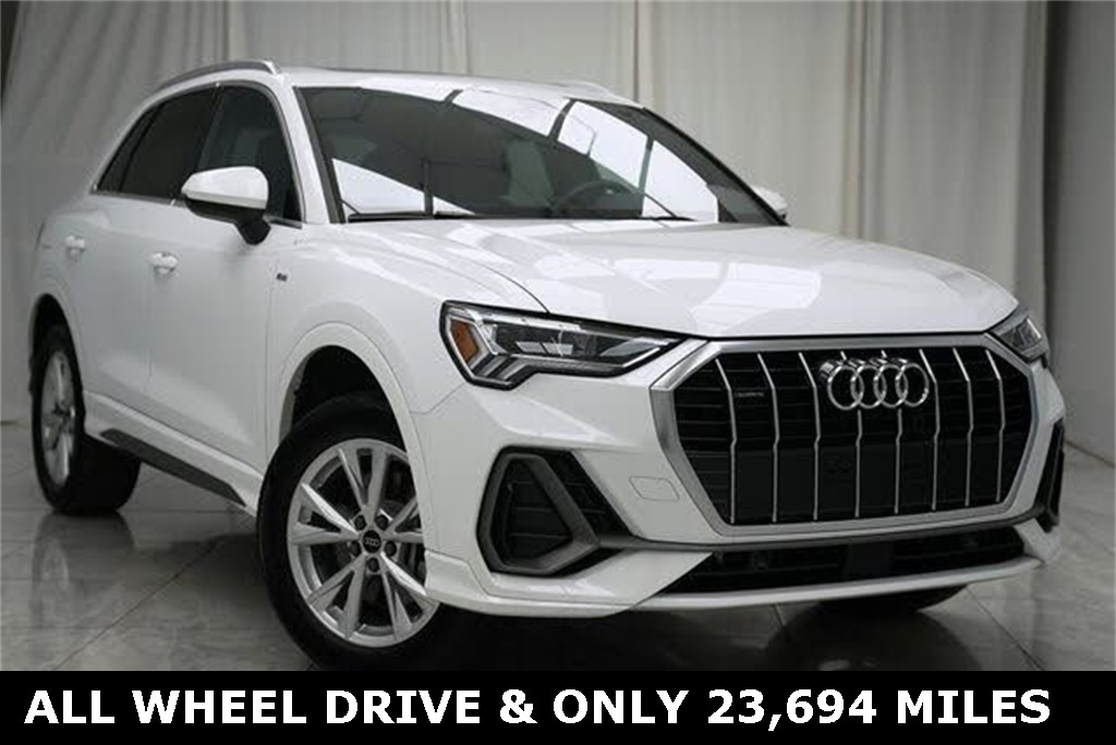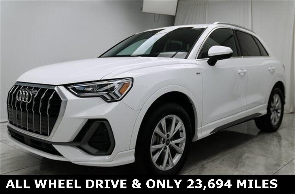 CARFAX One-Owner. Clean CARFAX. ** Clean Carfax 1-Owner Accident Free History, ** Apple CarPlay/Android Auto, ** Adaptive Cruise Control, ** Blind Spot Monitor, ** Cross Traffic Alert, ** Alloy Wheels / Premium Wheels, ** Heated Seats, ** Bluetooth, Hands Free, ** Brake Assist, ** Camera Backup, ** Chrome Wheels / Premium Wheels / Custome Whwels, ** Cruise Control, ** Heated Steering Wheel, ** Keyless Entry, ** Lane Departure Warning, ** Leather Seats, ** LED Headlights, ** Navigation System, ** Power Panoramic (Pano) Sunroof / Moonroof, ** Premium Sound System / Premium Audio, ** Roof Rack, ** Stability Control, ** Steering Wheel Controls, ** Sunroof/Moonroof, ** USB Port, ** Clean Carfax Accident Free History, ** Power Drivers Seat, Drivetrain & Performance Standard AWD (Quattro) all-wheel drive for improved traction and handling in varied conditions. Edmunds Powered by a 2.0-liter turbocharged inline-4 engine with either: ~184 hp (standard 40 TFSI version) or ~228 hp if equipped with the 45 TFSI engine (S line or upgraded). carweek.com 8-speed automatic transmission. Edmunds Fuel Economy EPA combined ~23 MPG (city ~20 / highway ~28)., AWD, ALL WHEEL DRIVE, Comfort & Convenience Leather seating surfaces with power-adjustable front seats (often included). Audi Kirkwood Panoramic sunroof. Audi Louisville Power tailgate. Audi Louisville Three-zone climate control (in many examples). TrueCar ð"± Technology Audi MMI infotainment with touchscreen and smartphone integration (Apple CarPlay & Android Auto). Audi Louisville Digital instrument cluster (typically ~10.25â²â²). Audi Louisville ð" Safety & Driver Aids Audi pre sense® front and basic safety systems. Audi Louisville Blind-spot monitoring, lane departure warning options available. Audi Kirkwood Back-up camera & parking sensors., Q3 Premium S Line quattro, 4D Sport Utility, 2.0L 4-Cylinder TFSI, 8-Speed Automatic with Tiptronic, quattro, Glacier White Metallic, Navigation System.