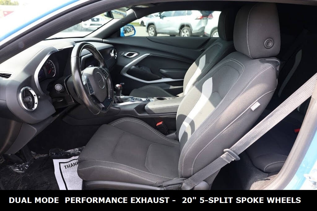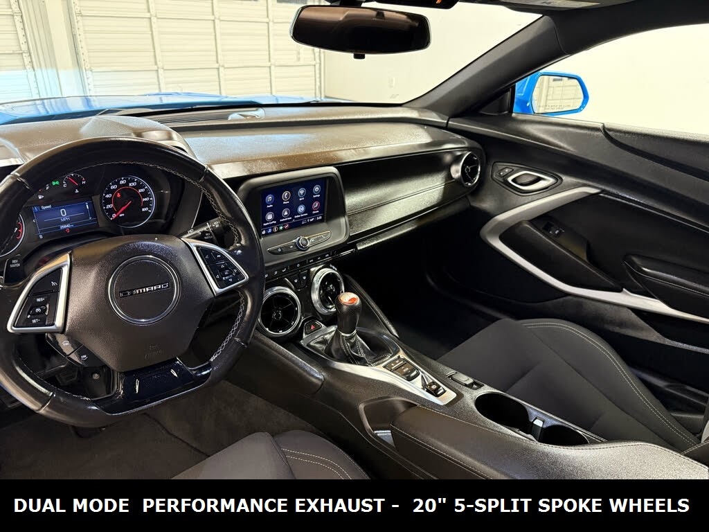 CARFAX One-Owner. ** Apple CarPlay/Android Auto, ** Alloy Wheels / Premium Wheels, ** Bluetooth, Hands Free, ** Brake Assist, ** Camera Backup, ** Chrome Wheels / Premium Wheels / Custome Whwels, ** Cruise Control, ** LED Headlights, ** Premium Sound System / Premium Audio, ** Stability Control, ** Steering Wheel Controls, ** USB Port, ** Power Drivers Seat, WHEELS, 20" 5-SPLIT SPOKE, 6.2L, EXHAUST, DUAL MODE PERFORMANCE, 6-Speed Manual, Engine & Performance Engine: 6.2-liter LT1 V8 with direct injection and variable valve timing â" a naturally aspirated small-block Chevy V8. Horsepower: 455 hp @ ~6000 rpm. Torque: 455 lb-ft @ ~4400 rpm. Transmission: 6-speed manual with Active Rev Matching (for smoother downshifts). Drivetrain: Rear-wheel drive (RWD). 0â"60 mph: ~4.0â"4.3 seconds (manual). Top Speed: Typically electronically limited near ~155 mph on V-8 models, Typical EPA estimates for the 6.2L V8 with the 6-speed manual are: City: ~16 mpg Highway: ~24 mpg Combined: ~19 mpg (Actual mileage varies with driving style and conditions.) Premium gasoline is recommended for best performance and to avoid detonation., Camaro LT1 6.2L, 2D Coupe, 6.2L V8, 6-Speed Manual, RWD, Rapid Blue, Jet Black Cloth, Decklid-Mounted Lip Spoiler, Preferred Equipment Group LT1, Satin Black Appearance Package.