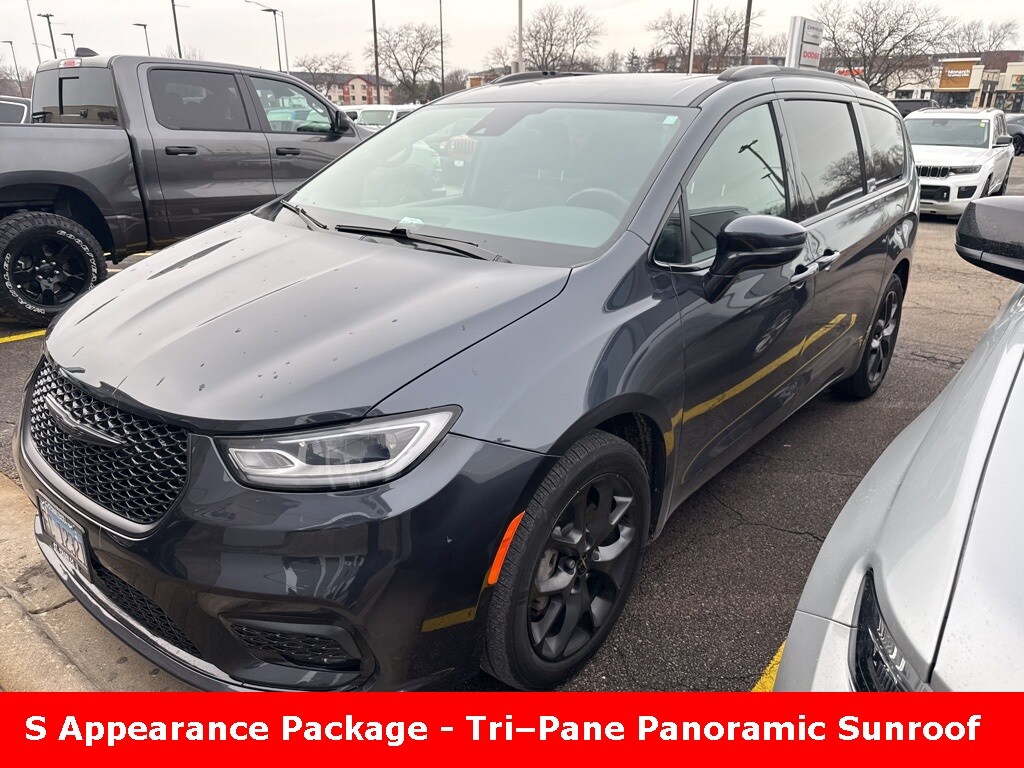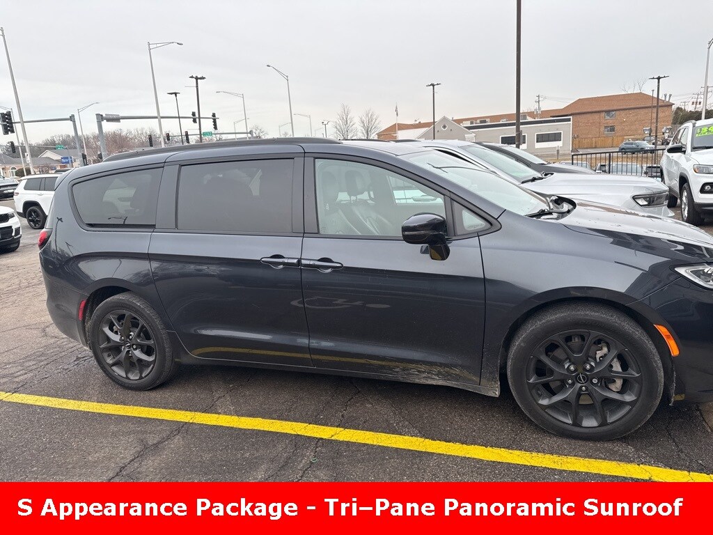 ** Apple CarPlay/Android Auto, ** Adaptive Cruise Control, ** Blind Spot Monitor, ** Cross Traffic Alert, ** Alloy Wheels / Premium Wheels, ** Heated Seats, ** Cooled Seats, ** Bluetooth, Hands Free, ** Brake Assist, ** Camera Backup, ** Chrome Wheels / Premium Wheels / Custome Whwels, ** Cruise Control, ** Heated Steering Wheel, ** Keyless Entry, ** Lane Departure Warning, ** Leather Seats, ** LED Headlights, ** Navigation System, ** Power Panoramic (Pano) Sunroof / Moonroof, ** Premium Sound System / Premium Audio, ** Roof Rack, ** Stability Control, ** Steering Wheel Controls, ** Sunroof/Moonroof, ** Third Row Seating / 3rd Row Seating, ** USB Port, ** Clean Carfax Accident Free History, ** Power Drivers Seat, Triâ"Pane Panoramic Sunroof, S Appearance Package, 20" x 7.5" Foreshadow Painted Aluminum Wheels, What the S Appearance Package Includes Hereâs what the 2019â"2021 Pacifica S Appearance Package typically adds when ordered on a Limited model (includes both gas and hybrid versions where available): Exterior Enhancements 18-inch S-model aluminum wheels (Foreshadow finish) â" sportier wheel design Anodized Ink badging and black âSâ badge Black daylight opening moldings â" darker window trim Black Stow ân Place® roof rack Body-color door handles and mirrors for a cleaner look Premium front fascia upper/lower grille with black surround Premium black rear fascia for a more aggressive rear styling â¡ï¸ All these elements replace or darken many of the bright chrome trim pieces found on a standard Limited., Interior Accents Piano Black interior accents Leather-wrapped steering wheel Unique S-style seats (often black or with S logo depending on trim level), Pacifica Limited S Appearance Package, 4D Passenger Van, 3.6L V6 24V VVT, 9-Speed 948TE Automatic, AWD, Maximum Steel Metallic Clearcoat, Black Leather, 13 Speakers, Anodized Ink Badging, Black Day Light Opening Moldings, Black Stow N Place Roof Rack, Body Color Door Handles, Body Color Exterior Mirrors, GPS Navigation, Nappa Leather Bucket Seats w/S Logo, Navigation System, Piano Black Interior Accents, Premium Fascia Upper/Lower Grille w/Black Surround, Premium Rear Fascia Black, Quick Order Package 27P, S Appearance Package, S Badge, Wheels: 18" x 7.5" S-Model Aluminum Design 2.