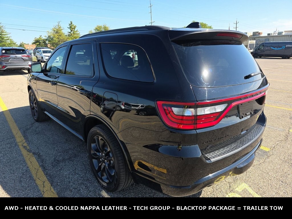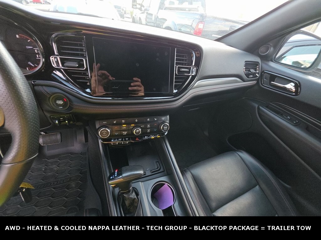 Clean CARFAX. ** Apple CarPlay/Android Auto, ** Adaptive Cruise Control, ** Blind Spot Monitor, ** Cross Traffic Alert, ** Alloy Wheels / Premium Wheels, ** Heated Seats, ** Cooled Seats, ** Bluetooth, Hands Free, ** Brake Assist, ** Camera Backup, ** Chrome Wheels / Premium Wheels / Custome Whwels, ** Cruise Control, ** Heated Steering Wheel, ** Keyless Entry, ** Lane Departure Warning, ** Leather Seats, ** LED Headlights, ** Memory Seat, ** Premium Sound System / Premium Audio, ** Roof Rack, ** Stability Control, ** Steering Wheel Controls, ** Third Row Seating / 3rd Row Seating, ** Tow Hitch / Trailer Hitch, ** USB Port, ** Clean Carfax Accident Free History, ** Power Drivers Seat, ** Power Passenger Seat, ALL WHEEL DRIVE, AWD, Blacktop Package, Trailer Tow Group IV, Secondâ"row fold and tumble captain chairs, Secondâ"row console with armrest and storage, Nappa leatherâ"faced bucket seats, Front ventilated seats, Technology Group, Item Detail Engine 5.7âL HEMI V8 Iimedia Events +2 Automobile Catalog +2 Power / Torque ~360 hp, ~390 lbâft torque Automobile Catalog +2 Iimedia Events +2 Transmission 8âspeed automatic (ZF 8HP70) autoevolution +2 Iimedia Events +2 Drivetrain AWD (AllâWheel Drive) autoevolution +3 PR Newswire +3 Automobile Catalog +3 Towing Capacity ~7,400 lbs standard; up to ~8,700 lbs with the âTow N Goâ package PR Newswire +3 autoevolution +3 conceptcarz.com +3 Fuel Economy (Combined) ~17 mpg combined (typical for V8 AWD) autoevolution +2 Automobile Catalog +2 Seats / Capacity 7 passengers; 3 rows seating Edmunds +2 Cars.com +2 Cargo Space ~17.2 cu ft behind third row; much more with rows folded Edmunds +1 Curb Weight ~5,313 lbs, Durango R/T AWD 5.7 V8 HEMI, 4D Sport Utility, HEMI 5.7L V8 Multi Displacement VVT, 8-Speed Automatic, AWD, DB Black Crystal Clearcoat, Black Leather, 1 USB Charging Port in Console, 12V Auxiliary Power Outlet In Console, 2nd Row Console w/Armrest & Storage, 3rd Row Floor Mat & Full Console, Adaptive Cruise Control w/Stop, Advanced Brake Assist, Blacktop Package, Class IV Receiver Hitch, Full Speed Forward Collision Warning Plus, Gloss Black Badges, Gloss Black Exterior Mirrors, GPS Navigation, Heavy-Duty Engine Cooling, Illuminated Rear Cupholders, Lane Departure Warning Plus, Navigation System, Navigation system: TomTom, Quick Order Package 22S, Rear Load Leveling Suspension, Satin Black Dodge Tail Lamp Badge, Technology Group, Trailer Brake Control, Trailer Tow Group IV, Wheels: 20" x 8.0" Black Noise Aluminum.