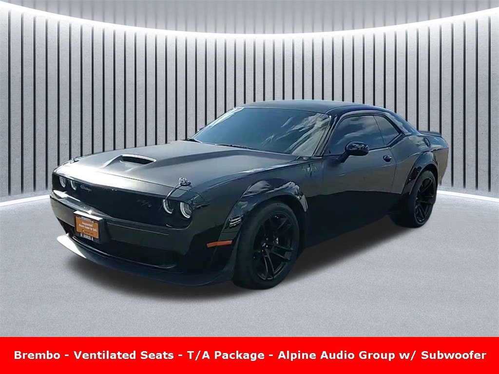 CARFAX One-Owner. Clean CARFAX. ** Clean Carfax 1-Owner Accident Free History, ** Apple CarPlay/Android Auto, ** Adaptive Cruise Control, ** Blind Spot Monitor, ** Cross Traffic Alert, ** Alloy Wheels / Premium Wheels, ** Heated Seats, ** Bluetooth, Hands Free, ** Brake Assist, ** Camera Backup, ** Chrome Wheels / Premium Wheels / Custome Whwels, ** Cruise Control, ** Heated Steering Wheel, ** Keyless Entry, ** Lane Departure Warning, ** Leather Seats, ** LED Headlights, ** Navigation System, ** Premium Sound System / Premium Audio, ** Stability Control, ** Steering Wheel Controls, ** USB Port, ** Clean Carfax Accident Free History, ** One Owner, ** Power Drivers Seat, ** Power Passenger Seat, 6â"Speed Manual TREMEC Transmission, Widebody, Interior Appearance Group by Mopar, Alpine® Audio Group with Subwoofer, Uconnect® 4C NAV with 8.4â"Inch Touch Screen Display, Key Specifications & Performance Engine: 6.4 L â392â HEMI Vâ8 Power / Torque: ~ 485 hp and 475 lbâft torque Digimag +2 Dodge Garage +2 Transmission: Tremec 6âspeed manual is standard in these models (with Widebody / T/A 392) Velocity Journal +3 Dodge Garage +3 Digimag +3 Drivetrain: Rearâwheel drive (RWD) Dodge Garage +2 Digimag +2 Widebody & T/A / Plus / Package Upgrades Hereâs what the âWidebody + T/A / Plus / Widebody Packageâ brings: Adds 3.5 inches of width overall via wider fenders / wider stance. Dodge Garage +2 Cars.com +2 Tires/wheels: 305/35ZR20 tires on 20Ã11âinch wheels all around. Dodge Garage +2 Cars.com +2 Adaptive damping suspension: SRTâtuned, for better handling. Dodge Garage +2 Cars.com +2 Brakes: Upgraded Brembo performance brakes (especially front) in many of these widebody trims., Visual / Interior Features of the T/A / âPlusâ Packages âT/Aâ and âPlusâ add styling and creature comforts: SatinâBlack hood, roof and deck lid wrap (or paint) plus T/A graphic/stripes. Dodge Garage +2 conceptcarz.com +2 âAir Catcherâ headlights with LEDâilluminated T/A logos. Dodge Garage +1 NACA ducted hood that feeds a modified Hellcat airâbox with a Mopar conical filter. conceptcarz.com +1 Whiteâface gauges (70sâ/71âstyle âticâtocâtachâ cluster) for T/A models. Dodge Garage +1 Interior upgrades such as performance seats (cloth or clothâleather mixes with houndstooth, etc.), plus options like Nappa leather, heated & ventilated front seats if âPlusâ or other appearance/tech packages are included. Dodge Garage +2 AMENCARS +2, Challenger R/T Scat Pack Widebody T/A Package, 2D Coupe, SRT HEMI 6.4L V8, Tremec 6-Speed Manual, RWD, Pitch Black Clearcoat, Black w/Houndstooth Cloth Sport Seat or Nappa Leather Sport Seat, 392 Fender Decal, 506 Watt Amplifier, 9 Amplified Speakers w/Subwoofer, Adaptive Damping Suspension, Alpine Audio Group w/Subwoofer, Black Grille w/Bezel, Black Satin Painted Hood, Blind Spot & Cross Path Detection, Body Color Exterior Mirrors, Brembo 6-Pot Fixed Front Caliper Brakes, Door Trim Panel w/Ambient Lighting, Driver Convenience Group, Exterior Mirrors w/Heating Element, Flat-Bottom Steering Wheel, Functional Hood Scoop, Gloss Black I/P Cluster Trim Rings, GPS Navigation, High-Intensity Discharge Headlamps, Illuminated Air-Catcher Headlamps, Mopar Bright Door Sills, MOPAR Cold Air Intake System, Mopar Interior Appearance Group, MOPAR Premium Floor Mats w/Logo, Navigation System, Performance Shift Indicator, Plus Package, Power Multi-Function Foldaway Mirrors, Premium-Stitched Dash Panel, Quick Order Package 23N R/T Scat Pack Widebody, Rhombi 2-Pc Wheel Center Cap, Satin Wrap Roof/Decklid, Surround Sound, T/A Bodyside Graphic, T/A Package, T/A Spoiler Decal, Trunk Mat w/Logo, Wheels: 20" x 11.0" Devil's Rim Granite, White Face Instrument Cluster, Widebody Competition Suspension, Widebody Fender Flares.