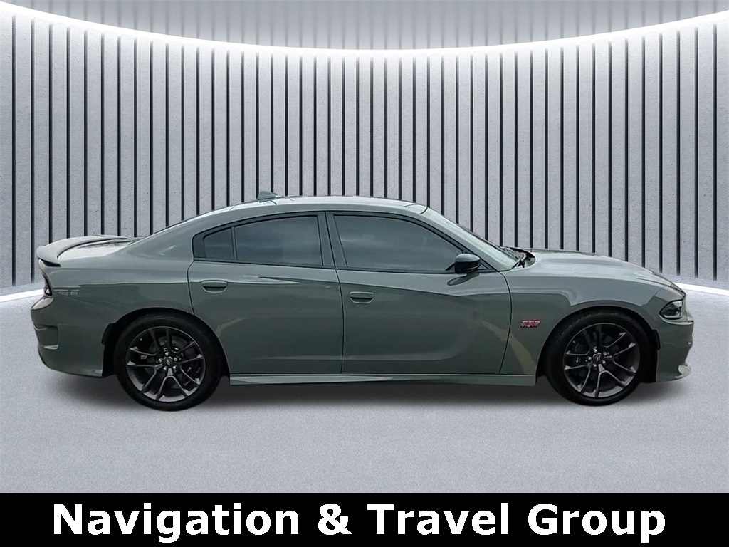 CARFAX One-Owner. ** Apple CarPlay/Android Auto, ** Alloy Wheels / Premium Wheels, ** Heated Seats, ** Bluetooth, Hands Free, ** Brake Assist, ** Camera Backup, ** Chrome Wheels / Premium Wheels / Custome Whwels, ** Cruise Control, ** Heated Steering Wheel, ** Keyless Entry, ** LED Headlights, ** Navigation System, ** Premium Sound System / Premium Audio, ** Stability Control, ** Steering Wheel Controls, ** USB Port, ** Power Drivers Seat, Navigation & Travel Group, SRT HEMI 6.4L V8 MDS, Here are some of the major numbers for the 2023 Charger Scat Pack (RWD, standard, nonâWidebody version unless noted): Specification Figure Engine 6.4âliter (392 cu in) HEMI V8 TrueCar +3 Car and Driver +3 www.ucfs.com +3 Horsepower 485 hp @ ~ 6,100 rpm Car and Driver +2 ScatPack +2 Torque 475 lbâft @ ~4,100 rpm Car and Driver +2 Automobile Catalog +2 Transmission 8âspeed automatic Car and Driver +2 Cars.com +2 Drive RearâWheel Drive (RWD) Car and Driver +2 Cars.com +2 0â60 mph â 4.3 seconds Automobile Catalog +2 Car and Driver +2 Quarter mile (~1â4 mi) â 12.4 seconds Automobile Catalog +1 Top Speed ~180 mph (theoretical) Automobile Catalog +1 Fuel Economy (EPA) ~ 15 mpg city / 24 mpg highway / 18 mpg combined ScatPack +3 TrueCar +3 Car and Driver +3 Curb Weight ~ 4,360â4,385 lbs depending on equipment, Compared to lower trims, the Scat Pack (R/T Scat Pack) includes or offers: Brembo performance brakes (front, often multiâpiston) for better stopping power. Sunnyside CDJR +2 TrueCar +2 Performance suspension and tuning for better handling. Sunnyside CDJR +2 Car and Driver +2 Line Lock and Launch Control features for better straightâline launches and burnout control. Sunnyside CDJR +2 TrueCar +2 Adaptive damping / performanceâtuned shocks in some versions. dodge +2 TrueCar +2 Larger wheels with performance tires (20âinch, wider fitments) Car and Driver +2 Group 1 Automotive +2 Interior & tech: Performance Pages (tracking power/TQ, etc.), upgraded audio options, upgraded trim/appliances. TrueCar +2 www.ucfs.com +2, Charger R/T Scat Pack, 4D Sedan, SRT HEMI 6.4L V8 MDS, 8-Speed Automatic, RWD, Destroyer Gray Clearcoat, Black Cloth, 1-Yr SiriusXM Guardian Trial, 2-Piece Shark Fin Antenna, 4G LTE Wi-Fi Hot Spot, 5-Year SiriusXM Traffic Service, 5-Year SiriusXM Travel Link Service, 8.4" Touchscreen Display, Apple CarPlay, Compass Gauge, For Details, Visit DriveUconnect.com, Google Android Auto, GPS Antenna Input, GPS Navigation, HD Radio, Integrated Center Stack Radio, Integrated Voice Command w/Bluetooth, Media Hub (2 USB, AUX), Navigation & Travel Group, Navigation System, Quick Order Package 21W Scat Pack, Radio: Uconnect 4C Nav w/8.4" Display, SiriusXM Traffic Plus, SiriusXM Travel Link, USB Host Flip.
