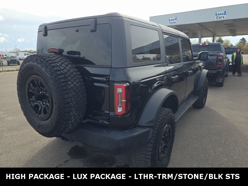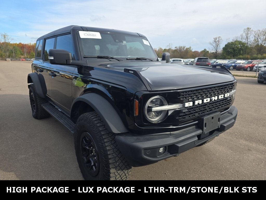 ** Apple CarPlay/Android Auto, ** Adaptive Cruise Control, ** Blind Spot Monitor, ** Cross Traffic Alert, ** Alloy Wheels / Premium Wheels, ** Heated Seats, ** Bluetooth, Hands Free, ** Brake Assist, ** Camera Backup, ** Chrome Wheels / Premium Wheels / Custome Whwels, ** Cruise Control, ** Heated Steering Wheel, ** Keyless Entry, ** Leather Seats, ** LED Headlights, ** Premium Sound System / Premium Audio, ** Stability Control, ** Steering Wheel Controls, ** USB Port, ** Clean Carfax Accident Free History, ** Power Drivers Seat, 12" LCD CTR STACK TOUCHSCREEN, HIGH PACKAGE, LTHR-TRM/VINYL SSTONE/BLK STS, LUX PACKAGE, Key Specifications Here are some of the main specs for this configuration: Engine: 2.7 L EcoBoost V6 (twin-turbo) â" rated at 330 hp and 415 lb-ft of torque (with premium fuel) for the U.S. spec. caribe.ford.com +2 Le Guide de l'auto +2 Transmission: 10-speed automatic (in this variant) with 4WD. Fahrney Ford +1 Drivetrain: Four-wheel drive (4WD) / 4x4. Le Guide de l'auto +1 Fuel economy (as reported): ~19 mpg combined for U.S. 4-door version. Kbb.com Towing capacity: Up to ~3,500 lbs (with appropriate package) for this engine/trim. Le Guide de l'auto +1 Off-road capability: The Wildtrak trim comes with more aggressive suspension/badging compared to base trims. caribe.ford.com +1 Dimensions (4-door variant): Length around 189.5 in, width around 79.3 in, ground clearance ~11.5 in. Kbb.com, Bronco Wildtrak LUX PACKAGE, 4D Sport Utility, 2.7L EcoBoost V6, 10-Speed Automatic, 4WD, Shadow Black, 12" LCD Capacitive Touchscreen w/Swipe Capability, 2 Smart Charging USB Ports In Dashboard, 360-Degree Camera, Adaptive Cruise Control, Additional Sound Deadening, Connected Built-In Navigation, Equipment Group 354A Lux Package, Evasive Steering Assist, Front Parking Sensors, Heated Steering Wheel, Information on Demand Panel, Navigation System, Navigation system: Connected Navigation, Radio: B&O Sound System by Bang & Olufsen, Sideview Mirrors, Universal Garage Door Opener, Wireless Charging Pad.