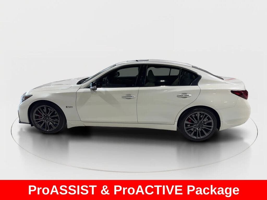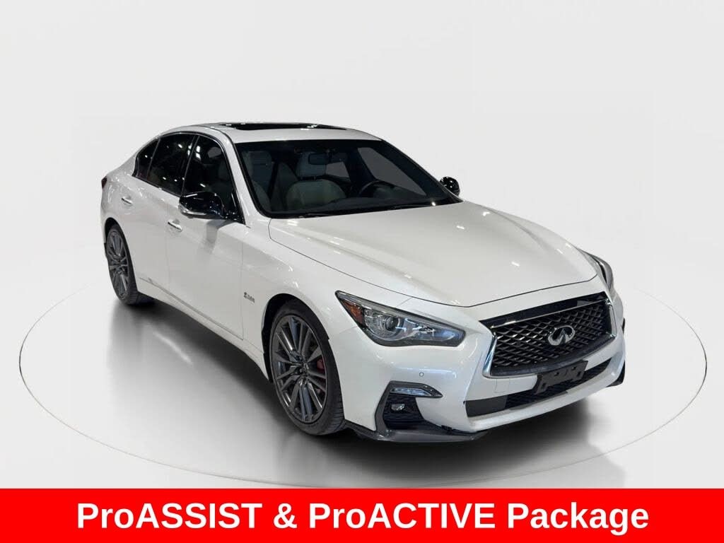 Clean CARFAX. ** Apple CarPlay/Android Auto, ** Adaptive Cruise Control, ** Blind Spot Monitor, ** Cross Traffic Alert, ** Alloy Wheels / Premium Wheels, ** Heated Seats, ** Bluetooth, Hands Free, ** Brake Assist, ** Camera Backup, ** Chrome Wheels / Premium Wheels / Custome Whwels, ** Cruise Control, ** Heated Steering Wheel, ** Keyless Entry, ** Lane Departure Warning, ** Leather Seats, ** LED Headlights, ** Navigation System, ** Premium Sound System / Premium Audio, ** Stability Control, ** Steering Wheel Controls, ** Sunroof/Moonroof, ** USB Port, ** Clean Carfax Accident Free History, ** Power Drivers Seat, ** Power Passenger Seat, awd, ALL WHEEL DRIVE, PROASSIST. PROACTIVE, Performance Engine: 3.0L twin-turbo V6 (VR30DDTT) Horsepower: 400 hp @ 6400 rpm Torque: 350 lb-ft @ 1600 rpm Transmission: 7-speed automatic Drivetrain: Intelligent AWD (ATTESA E-TS) Performance numbers 0â"60 mph: ~4.5 seconds Top speed: ~155 mph (electronically limited on most models) â½ Fuel Economy 19 mpg city 26 mpg highway 22 mpg combined Premium fuel is required. ðï¸ What makes the Red Sport 400 special Compared to normal Q50 models (300 hp), the Red Sport gets: Higher turbo boost for 400 hp Sport-tuned adaptive suspension Bigger performance brakes Red âSâ badges Sport exhaust and styling upgrades, Q50 Red Sport 400 AWD, 4D Sedan, 3.0L V6, 7-Speed Automatic with Overdrive, AWD, Pure White, Graphite w/Leather-Appointed Seating Surfaces, ABS brakes, Adaptive Front Lighting System, Alloy wheels, Blind-Spot Intervention (BSI), Compass, Direct Adaptive Steering, Distance Control Assist, ECO Pedal, Electronic Stability Control, Front dual zone A/C, Front Seat Pre-Crash Seat Belts, Heated door mirrors, Heated front seats, Heated Front Sport Seats, High Beam Assist (HBA) Headlamps, Illuminated entry, Intelligent Cruise Control, Lane Departure Prevention (LDP), Low tire pressure warning, Navigation System, Navigation system: INFINITI InTouch Navigation, Power moonroof, ProACTIVE Package, Remote keyless entry, Traction control.