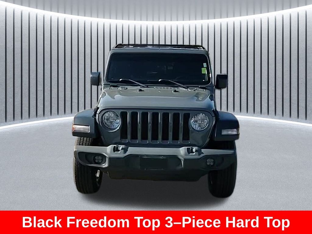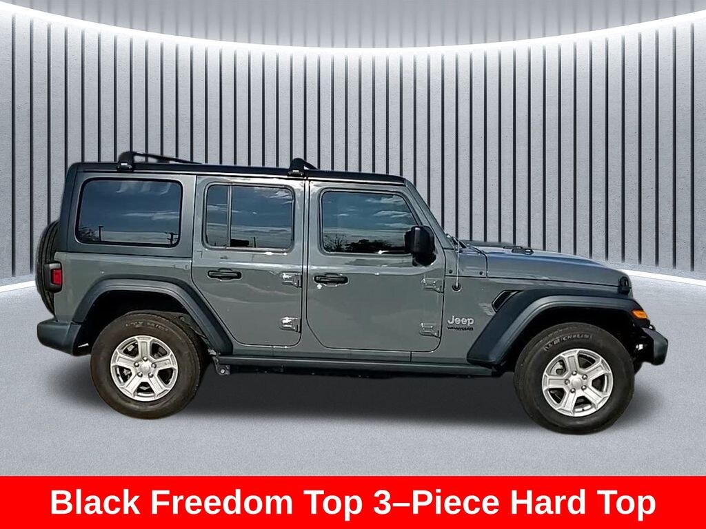 ** Apple CarPlay/Android Auto, ** Alloy Wheels / Premium Wheels, ** Bluetooth, Hands Free, ** Brake Assist, ** Camera Backup, ** Chrome Wheels / Premium Wheels / Custome Whwels, ** Cruise Control, ** Premium Sound System / Premium Audio, ** Stability Control, ** Steering Wheel Controls, ** USB Port, Basic Overview Body style: 4-door SUV (Unlimited) Drivetrain: 4WD Transmission: 8-speed automatic Seating: 5 passengers Platform: JL generation Wrangler âï¸ Engine & Performance Engine: 3.6L Pentastar V6 Horsepower: 285 hp @ 6,400 rpm Torque: 260 lb-ft @ 4,800 rpm Drive system: Command-Trac part-time 4Ã4 Max towing capacity: 3,500 lbs The Pentastar V6 is the most common Wrangler engine and is known for good durability and decent power for off-road driving. â½ Fuel Economy City: ~18 mpg Highway: ~23 mpg Combined: ~20 mpg, Wrangler Unlimited Sport S 4WD, 4D Sport Utility, 3.6L V6 24V VVT, 8-Speed Automatic, 4WD, Sting-Gray Clearcoat, Black Cloth, Automatic Headlamps, Deep Tint Sunscreen Windows, Front 1-Touch Down Power Windows, Leather Wrapped Steering Wheel, Power Heated Mirrors, Quick Order Package 24S Sport S, Remote Keyless Entry, Security Alarm, Speed Sensitive Power Locks, Sun Visors w/Illuminated Vanity Mirrors, Wheels: 17" x 7.5" Tech Silver Aluminum.