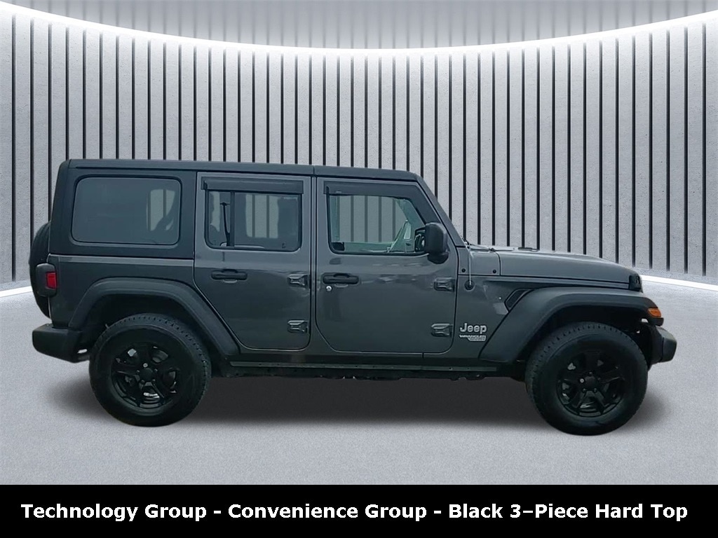 Clean CARFAX. Odometer is 797 miles below market average! ** Apple CarPlay/Android Auto, ** Alloy Wheels / Premium Wheels, ** Bluetooth, Hands Free, ** Brake Assist, ** Camera Backup, ** Chrome Wheels / Premium Wheels / Custome Whwels, ** Cruise Control, ** Keyless Entry, ** LED Headlights, ** Premium Sound System / Premium Audio, ** Stability Control, ** Steering Wheel Controls, ** USB Port, ** Clean Carfax Accident Free History, 4WD, 4X4, Technology Group, Convenience Group, Uconnect® 4 with 7â"Inch Display, Key Specs and Features Engine & Performance 2.0 L turbocharged inline-4. Stellantis Fleet +2 CarsDirect +2 Power: ~270 hp at ~5,250 rpm. www.automartusa.com +1 Torque: ~295 lb-ft at ~3,000 rpm. www.automartusa.com Transmission: 8-speed automatic. CarsDirect +1 Drivetrain: Part-time 4WD. www.cardealerships.com 4WD mode selector: âmanual hi-loâ per spec sheet. www.cardealerships.com Fuel Economy EPA combined: ~21 mpg. www.automartusa.com +1 City / Highway: ~21 / ~22 mpg for the 4-door 2.0L auto version. www.cardealerships.com Fuel grade: Regular (87 octane) is acceptable., Dimensions & Capacities 4-door (âUnlimitedâ) model. carweek.com Wheelbase: ~118.4 in. Automobile Catalog Fuel tank: ~21.5 gallons (for 4-door) per spec sheet. Amazon Web Services, Inc. Ground clearance: ~9.7 in (according to car-dealership spec sheet). www.cardealerships.com Tow capacity: According to the 2020 Jeep fleet buyerâs guide, max towing for 4-door is 3,500 lb. Stellantis Fleet Safety / Standard Features Skid plates, tow hooks standard (per fleet guide) â" off-road readiness. Stellantis Fleet Tire Pressure Monitoring. Stellantis Fleet Remote keyless entry is available. Stellantis Fleet Electronic stability control, hill start assist, etc (common on modern Wranglers)., Black 3â"Piece Hard Top, Wrangler Unlimited Sport S Technology Group, 4D Sport Utility, 2.0L I4 DOHC, 8-Speed Automatic, 4WD, Granite Crystal Metallic Clearcoat, Black Cloth, 7.0" Touchscreen Display, Air Conditioning w/Auto Temperature Control, Air Filtering, Apple CarPlay, Automatic Headlamps, Cluster 7.0" TFT Color Display, Convenience Group, Deep Tint Sunscreen Windows, Front 1-Touch Down Power Windows, Google Android Auto, GPS Antenna Input, Integrated Center Stack Radio, Leather Wrapped Steering Wheel, Power Heated Mirrors, Quick Order Package 22S Sport S, Radio: Uconnect 4 w/7" Display, Remote Keyless Entry, Security Alarm, SiriusXM Satellite Radio, Speed Sensitive Power Locks, Sun Visors w/Illuminated Vanity Mirrors, Technology Group, Universal Garage Door Opener, USB Host Flip, Wheels: 17" x 7.5" Tech Silver Aluminum.