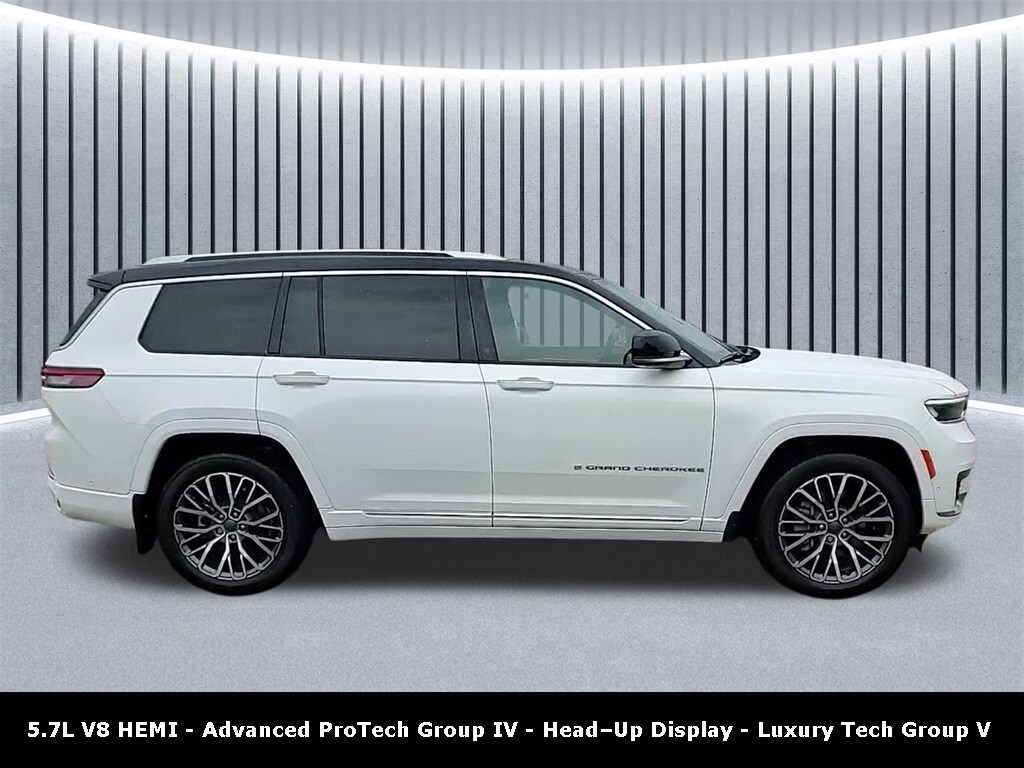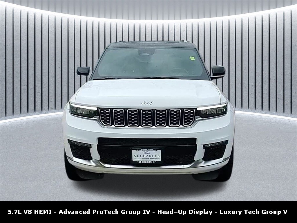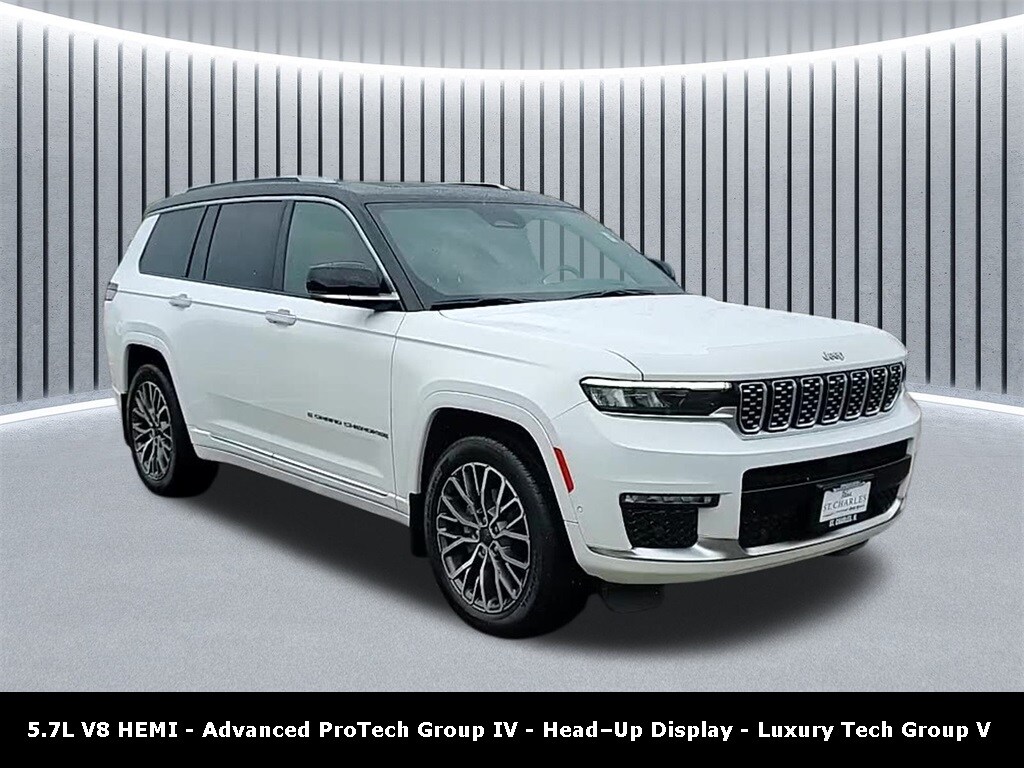Every Pre-driven vehicle has or is in the process of having all mechanical repairs and all required maintenance performed and completed prior to delivery. To provide you the peace of mind purchasing a pre-driven vehicle. Thatâs the St. Charles Guarantee. So relax and enjoy! Please call for availability. Bright White Clearcoat 2022 Jeep Grand Cherokee L 4D Sport Utility Summit 5.7 V8 HEMI HEMI 5.7L V8 Multi Displacement VVT 14/22 City/Highway MPG 8-Speed Automatic 4WD