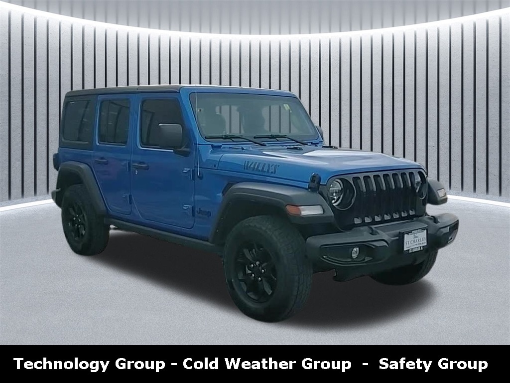 Priced below KBB Fair Purchase Price! Every Pre-driven vehicle has or is in the process of having all mechanical repairs and all required maintenance performed and completed prior to delivery. To provide you the peace of mind purchasing a pre-driven vehicle. Thatâs the St. Charles Guarantee. So relax and enjoy! Please call for availability. Hydro Blue Pearl Coat 2022 Jeep Wrangler 4D Sport Utility Unlimited Willys Technology Group 2.0L I4 DOHC 21/24 City/Highway MPG 8-Speed Automatic 4WD