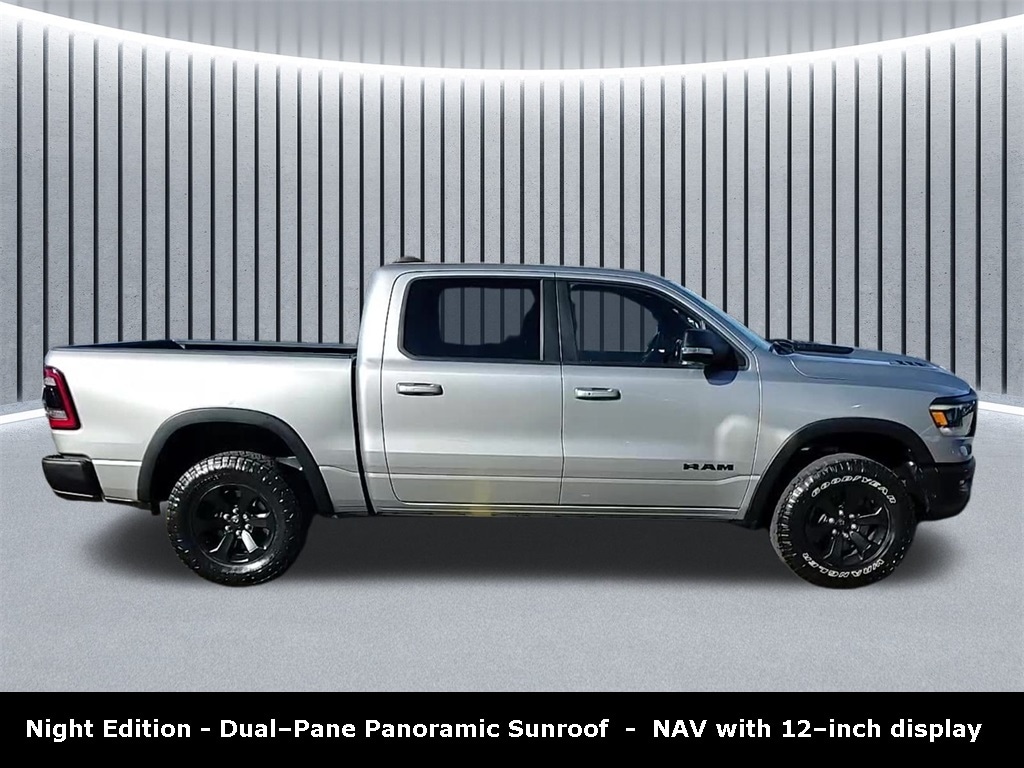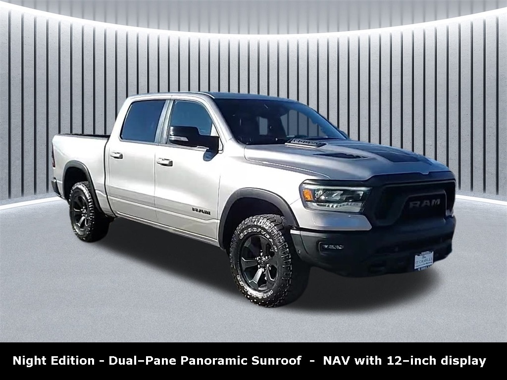 Clean CARFAX. ** Apple CarPlay/Android Auto, ** Adaptive Cruise Control, ** Blind Spot Monitor, ** Cross Traffic Alert, ** Alloy Wheels / Premium Wheels, ** Heated Seats, ** Bluetooth, Hands Free, ** Brake Assist, ** Camera Backup, ** Chrome Wheels / Premium Wheels / Custome Whwels, ** Cruise Control, ** Head-Up Display, ** Heated Steering Wheel, ** Keyless Entry, ** Lane Departure Warning, ** Leather Seats, ** LED Headlights, ** Navigation System, ** Power Panoramic (Pano) Sunroof / Moonroof, ** Premium Sound System / Premium Audio, ** Stability Control, ** Sunroof/Moonroof, ** Tow Hitch / Trailer Hitch, ** USB Port, ** Clean Carfax Accident Free History, ** Power Drivers Seat, ** Power Passenger Seat, 4wd, 4x4, HEMI 5.7L V8 Multi Displacement VVT, Dualâ"Pane Panoramic Sunroof, Mopar sprayâ"in bedliner, Feature / Package What It Adds / Changes Notes & Possible Options Rebel trim More offâroad capability, a rugged look, performance suspension, upgraded tires, etc. Standard with Rebel are things like the eLocker rear axle, 18âinch allâterrain tires, etc. digimag.rrd.com +1 Night Edition (Appearance) Blackedâout styling: gloss black wheels, black grille & badges, black front bumper & skid plate, dark accents. Stellantis Fleet +2 digimag.rrd.com +2 Tech Group Adds more convenience / electronics: larger display, perhaps digital rearview mirror, driver assist / safety features, maybe upgraded infotainment. Cars.com +2 TrueCar +2 Panoramic Roof / DualâPane Sunroof Bigger sunroof, more light, possibly dual panels. Optional extra cost, For a 2022 Rebel with Night Edition + Tech + Panoramic Roof, typically youâd expect: Engine / Performance: Most likely the 5.7L HEMI V8 (395 hp), with 4WD. Rebel has lifted/stronger offâroad bits. TrueCar +1 Exterior: ⢠Gloss black 18âinch wheels (Night Edition) digimag.rrd.com +2 digimag.rrd.com +2 ⢠Black grille / badges / black bumper & skid plate Stellantis Fleet +1 ⢠Panoramic sunroof / dualâpane sunroof optional, if you have that, it will add light & overhead glass; shade(s) included. Edmunds +2 TrueCar +2 Interior & Tech: ⢠Uconnect with large screen (12âinch likely, especially with Tech Group) digimag.rrd.com +2 TrueCar +2 ⢠Advanced safety features: maybe forward collision warning, blind spot, trailer sway control, etc. Stellantis Fleet +2 TrueCar +2 ⢠Comfort extras, maybe power seats, heated steering wheel, sound system upgrade if included. Cost / Pricing: The panoramic roof adds a premium, 1500 Rebel Panoramic Roof, 4D Crew Cab, HEMI 5.7L V8 Multi Displacement VVT, 8-Speed Automatic, 4WD, Billet Silver Metallic, Red/Black, 115V Auxiliary Rear Power Outlet, 2-Door Passive Entry, Front Door Locks, 2nd Row In Floor Storage Bins, 4G LTE Wi-Fi Hot Spot, 8.4" Touchscreen Display, Air Conditioning ATC w/Dual Zone Control, Apple CarPlay, Auto-Dimming Exterior Driver Mirror, Black Exterior Mirrors, Black Front Bumper w/Black Plate, Black Premium Power Mirrors, Bluetooth Handsfree Phone & Audio, Body Color Door Handles, Comfort/Convenience Group, Connectivity - US/Canada, Convex Wide-Angle Mirror Insert, Digital Rearview Mirror, Driver Seat Memory, Exterior Mirrors Courtesy Lamps, Exterior Mirrors w/Heating Element, Exterior Mirrors w/Memory, Exterior Mirrors w/Supplemental Signals, Foam Bottle Insert (Door Trim Panel), For Details, Visit DriveUconnect.com, Global Telematics Box Module (TBM), Google Android Auto, GPS Antenna Input, GPS Navigation, Grille Surround 2 Black Texture 3 Black, harman/kardon 19 Speaker Premium Sound, Heads-Up Display, Heated Front Seats, Heated Second Row Seats, Heated Steering Wheel, Integrated Center Stack Radio, LED CHMSL Lamp, Level 2 Equipment Group, Lux Leather Trimmed Bucket Seats, Media Hub w/2 Charge Only USBs, Navigation System, Night Edition, ParkSense Front/Rear Park Assist w/Stop, Power 2-Way Passenger Lumbar Adjust, Power 8-Way Driver & Passenger Seats, Power Adjustable Pedals, Power-Folding Mirrors, Quick Order Package 25W Reb