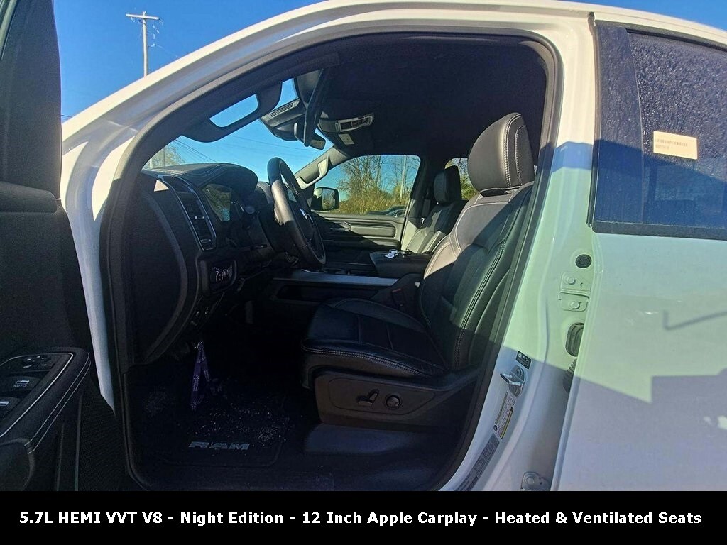 Clean CARFAX. ** Apple CarPlay/Android Auto, ** Adaptive Cruise Control, ** Blind Spot Monitor, ** Cross Traffic Alert, ** Alloy Wheels / Premium Wheels, ** Heated Seats, ** Cooled Seats, ** Bluetooth, Hands Free, ** Brake Assist, ** Camera Backup, ** Chrome Wheels / Premium Wheels / Custome Whwels, ** Cruise Control, ** Heated Steering Wheel, ** Keyless Entry, ** Lane Departure Warning, ** Leather Seats, ** LED Headlights, ** Premium Sound System / Premium Audio, ** Stability Control, ** Steering Wheel Controls, ** Tow Hitch / Trailer Hitch, ** USB Port, ** Clean Carfax Accident Free History, ** Power Drivers Seat, ** Power Passenger Seat, 4WD, 4X4, HEMI 5.7L V8 VVT, Rebel Level 2 Equipment Group, Triâ"fold soft tonneau cover, Front ventilated seats, 5.7L HEMI VVT V8 engine w/FuelSaver MDS & eTorqu, Black Mopar tubular side steps, Mopar sprayâ"in bedliner, Power 8â"way Driver/ Passenger seat, Power & Performance The 5.7 L HEMI V8 delivers roughly 395 hp and ~410 lb-ft of torque. savingbuilder.com +2 CarGurus +2 Transmission is the 8-speed automatic, paired with 4WD (so likely good for towing, off-road, or all-weather) for Sport 4WD versions. KOT Auto Group +2 Glendale CDJR +2 Depending on configuration, this setup offers some of the strongest performance among the 1500 lineup., The Night Edition package is all about giving the truck a sleek, aggressive, blacked-out aesthetic: Black-painted aluminum wheels (on higher trims or with Night Edition) â" often 22â²â² on upper trims. bobbradydodgechrysler.com +2 Dealer eProcess +2 Black grille, black-badged RAM logos (grille and tailgate), black mirrors, black exhaust tips, black window moldings. waltmasseycdjr.com +2 Dealer eProcess +2 Dark-internal-bezel headlamps and taillamps (no chrome trim) to maintain the ânightâ theme. Dealer eProcess +1 Some configurations include a sport performance hood, which adds to the truckâs more aggressive stance. Zimmer Chrysler Dodge Jeep Ram +1, Interior & Features Inside â" for upper trims using Night Edition â" you get premium black-trimmed interior, often with leather seats (depending on the trim). Zimmer Chrysler Dodge Jeep Ram +2 Dealer eProcess +2 Modern tech: 12-inch touchscreen infotainment (Uconnect), digital driver-information display (on limited / higher trim versions) likely available â" consistent with 2024 1500 offerings. Dealer eProcess +2 scarsviewchrysler.com +2 Useful truck-class functionality remains intact (bed, payload/towing capability, 4WD) as with any Ram 1500 that uses the 5.7 V8 package., 1500 Sport Night Edition, 4D Crew Cab, HEMI 5.7L V8 VVT, 8-Speed Automatic, 4WD, White, Black Exterior Mirrors, Exterior Mirrors w/Courtesy Lamps, Exterior Mirrors w/Memory Settings, Exterior Mirrors w/Turn Signals, Heated Exterior Mirrors, Mirror Clearance/Running Lights, Mirror-Mounted Aux Reverse Lamps, Navigation System, Power Folding Exterior Mirrors, Quick Order Package 27L Sport, Trailer Brake Control, Trailer Light Check, Trailer Reverse Steering Control, Trailer Tire Pressure Monitoring, Trailer Tow Group, Trailer Tow Mirrors.
