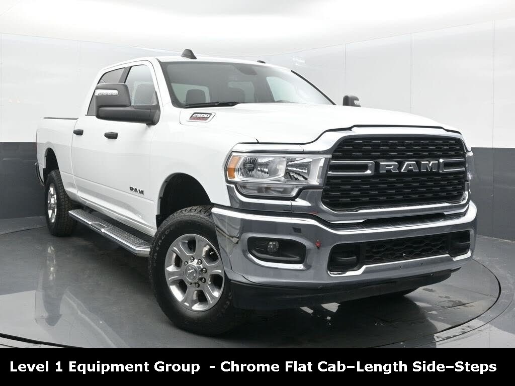 CARFAX One-Owner. ** Apple CarPlay/Android Auto, ** Alloy Wheels / Premium Wheels, ** Bluetooth, Hands Free, ** Brake Assist, ** Camera Backup, ** Chrome Wheels / Premium Wheels / Custome Whwels, ** Cruise Control, ** Keyless Entry, ** Premium Sound System / Premium Audio, ** Stability Control, ** Steering Wheel Controls, ** Tow Hitch / Trailer Hitch, ** USB Port, ** Power Drivers Seat, LONG BOX, Hereâs a clear overview of the 2024 RAM 2500 Big Horn Crew Cab 4Ã4 with the Long Box and the 6.4 L V8 (HEMI) gasoline engine: ð Model Summary: 2024 RAM 2500 Big Horn Configuration: Crew Cab · 4Ã4 · Long Box (6â² 4â²â²) · Big Horn trim · 6.4 L V8 HEMI gas engine ð ï¸ Engine & Performance Engine: 6.4 L V8 Heavy Duty HEMI MDS (gas) Horsepower: ~410 hp @ 5,600 rpm Torque: ~429 lb-ft @ ~4,000 rpm Transmission: 8-speed automatic (8HP75) Drivetrain: Part-time four-wheel drive (4Ã4) Fuel Tank: ~31 gallon capacity typical for this configuration This engine is the standard gasoline V8 on the RAM 2500 Big Horn and balances strong power with V-8 smoothness for towing, hauling, and everyday driving., Crew Cab: Spacious front and rear seating for passengers Long Box (6â² 4â²â²): Larger cargo bed for hauling materials, gear, or tools GVWR: ~10,000 lbs (varies slightly with equipment) Payload & Towing: Standard Class V hitch and trailer sway control help with heavy towing and hauling in this segment. Payload capacity is typically in the ~3,000-plus lb range and max towing generally around 14,000-15,000+ lbs depending on options and setup (exact capacities depend on package and configuration), Long Box (6â² 4â²â²): Larger cargo bed for hauling materials, gear, or tools, 2500 Big Horn 4WD 6.4L CREW CAB, 4D Crew Cab, 6.4L V8, 8-Speed Automatic, 4WD, Bright White Clearcoat, Diesel Gray/Black Cloth, 2nd Row In Floor Storage Bins, 4G LTE Wi-Fi Hot Spot, 8.4" Touchscreen Display, Apple CarPlay, Auto Power-Folding Mirrors, Big Horn IP Badge, Black Exterior Mirrors, Bluetooth Handsfree Phone & Audio, Center Hub, Connectivity - US/Canada, Dual Glove Boxes, Exterior Mirrors Courtesy Lamps, Exterior Mirrors w/Heating Element, Exterior Mirrors w/Supplemental Signals, Foam Bottle Insert (Door Trim Panel), Footwell Courtesy Lamp, For Details, Visit DriveUconnect.com, For More Info, Call 800-643-2112, Forward & Reverse Utility Lights, Front Fog Lamps, Global Telematics Box Module (TBM), Glove Box Lamp, Google Android Auto, GPS Antenna Input, Integrated Center Stack Radio, Integrated Voice Command w/Bluetooth, Leather Wrapped Steering Wheel, Level 1 Equipment Group, Locking Lower Glove Box, Mirror Running Lights, Power Adjust Mirrors, Power Adjustable Convex Aux Mirrors, Power Heated Fold Telescope Mirrors, Power Telescoping Mirrors, Premium Cloth 40/20/40 Bench Seat, Quick Order Package 2HZ Big Horn, Radio: Uconnect 5 W w/8.4" Display (A62), Rear Dome w/On/Off Switch Lamp, Selectable Tire Fill Alert, SiriusXM Radio Service, SiriusXM Satellite Radio, Steering Wheel Mounted Audio Controls, Wheels: 18" x 8.0" Polished Aluminum.